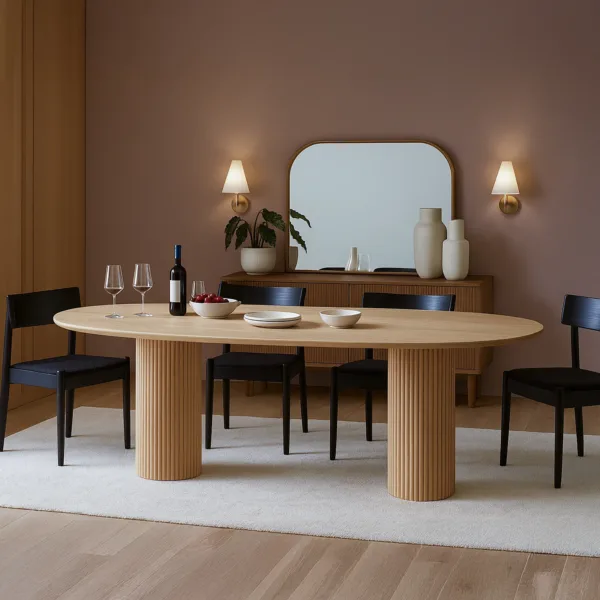 Bentuk Meja Makan Oval memberi kesan lembut sekaligus mewah, cocok untuk ruang makan rumah maupun restoran. Anda dapat menyesuaikan ukuran dan finishing agar selaras dengan gaya interior residential atau komersil. Tampilannya yang elegan menjadikannya pilihan ideal bagi ruang yang membutuhkan estetika dan fungsi sekaligus.